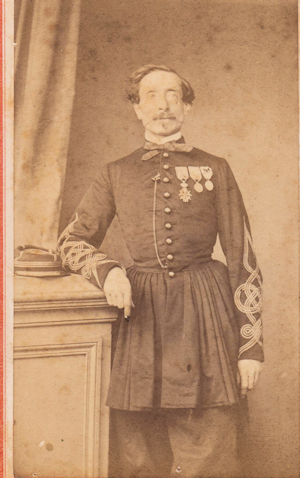 Auguste Défendant Colombani Né le 2/1/1818 à Bastia, il est élève à Saint Cyr en 1837 et est nommé Sous Lieutenant le 1/10/1840 au 43e régiment de ligne. Nommé Lieutenant le 10/3/1844, il sert en Afrique entre octobre 1845 et fevrier 1850. Promu Capitaine le 17/2/1850, il participe aux événement de 1851 en France. Le 24/1/1855, il est envoyé en Orient et participe au siège de Sébastopol. Il est blessé au bras gauche par un coup de feu dans la nuit du 23 au 24 avril 1855 et doit subir l'amputation du bras. Décoré de la Légion d'Honneur, et de la médaille britanique de Crimée, il revient en France le 1/7/1855. Remis de sa blessure, il passe dans le corps de l'intendance militaire comme adjoint à l'intendance de 2e classe le 12/11/1856. Promu adjoint de 1ere classe le 30/12/1858, puis sous intendant militaire de 2e classe le 5/7/1865. Il reçoit l'ordre du Medjidié (4e classe) le 13/2/1868. Il participe au siège de Paris de l'hiver 1870 et est nommé officier de la Légion d'Honneur le 7/1/1871. Il est mort le 18/6/1878. Photo Rousseton et Appert (Paris) |