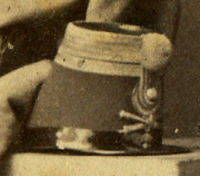 Les officiers portent aussi le képi (bonnet de police à visière) bleu foncé, sans ornement, mais avec les marques de grade figurées par les tresses. A partir de 1860, les officiers portent aussi le bonnet de police à soufflets.