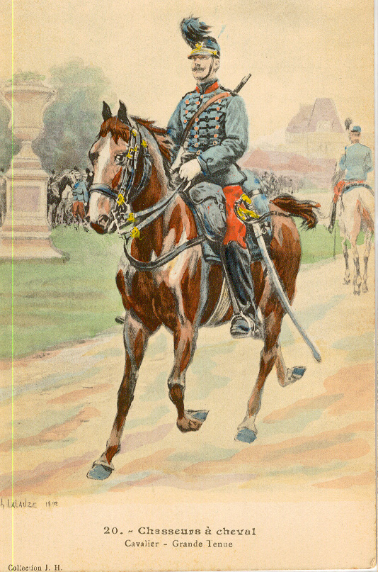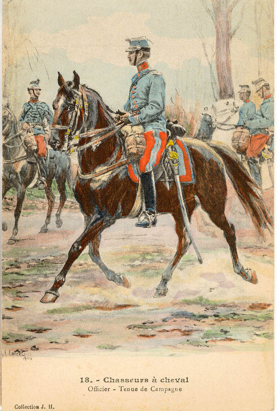 En 1872 les chasseurs reçoivent un dolman bleu ciel, orné de neuf brandebourgs noirs et fermé de trois rangées de boutons. Le képi est orné d'un cor. Le collet est garance, liseré bleu ciel. Le pantalon est en drap garance.