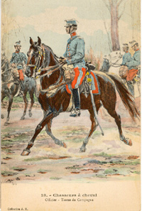 Le officiers de chasseurs portent la giberne jusqu'en 1880. Le couvre chef est le schako (orné d'un cor) ou le képi (modèle 1868 avec un cor sur le ruban, puis modèle 1873 avec le numéro du régiment sur le bandeau).