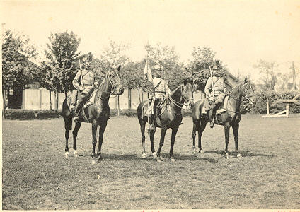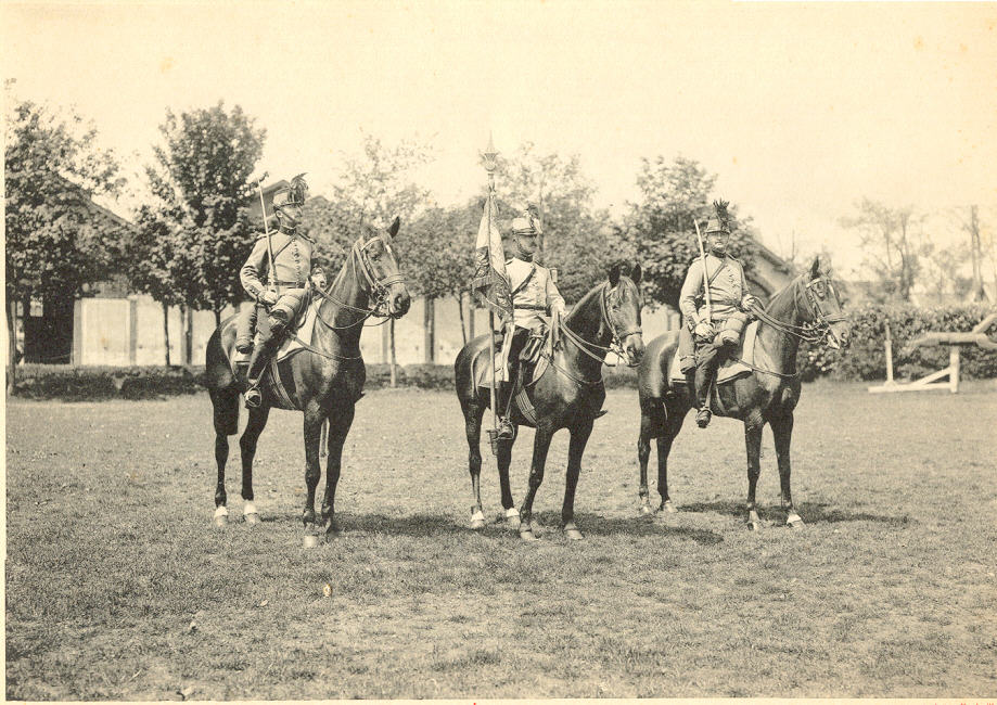 La garde de l'étendard des troupes à cheval était légèrement différente. Le porte drapeau, en général un lieutenant, portait sur le schako ou le casque le plumet tricolore (rouge en haut). Exceptionnelement, il pouvait s'agir d'un adjudant (exemple ci dessous avec le 1er Chasseurs en 1911). La garde se composait règlementairement de deux maréchaux des logis et de trois cavaliers de première classe.
