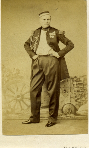 Marc Antoine Auguste Chapot Né le 3/11/1822 à Grenoble, fils d'un professeur du college royal de la ville, il est élève de Saint Cyr en 1841 et promu Sous Lieutenant le 1/4/1843 au 21e régiment d'infanterie légère, puis Lieutenant le 9/6/1848. Il est au corps d'occupation de Rome entre juillet 1851 et avril 1855, ayant été promu Capitaine le 30/12/1854. En janvier 1855, son régiment devient le 96e régiment de ligne et Chapot part en Orient et reste en Crimée d'avril à septembre 1855. C'est en Crimée qu'il rejoint la Garde Impériale et le 2e régiment des grenadiers (le 30/8/1855). Avec ce régiment, il fait l'assaut de Sébastopol, puis la campagne d'Italie. Il est promu chevalier de la Légion d'Honneur en 1858, puis nommé adjudant major du régiment le 13/7/1862. C'est dans cet uniforme, portant les épaulettes d'argent, qu'il est photographié vers 1864. Le 12/3/1866, il est promu Chef de bataillon au 15e régiment d'infanterie et il fait la guerre de 1870, jusqu'à la capitulation de Metz. A Saint Privat, le régiment se déploie en début d'après midi entre Amanvilliers et la ferme de Montigny la Grange. Il a à souffrir du bombardement de 80 pièces d'artillerie qui lui blesse tous ses officiers supérieurs et lui coûte près de 550 hommes tués ou blessés. Chapot est blessé au cou et à l'épaule par un boulet et est nommé officier de la Légion d'Honneur. Après la guerre, il passe au 12e régiment d'infanterie en octobre 1873. Retraité en octobre 1875, il est mort le 17/8/1892. Photo Prevot (Paris) |