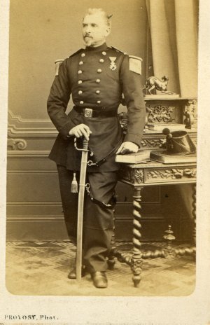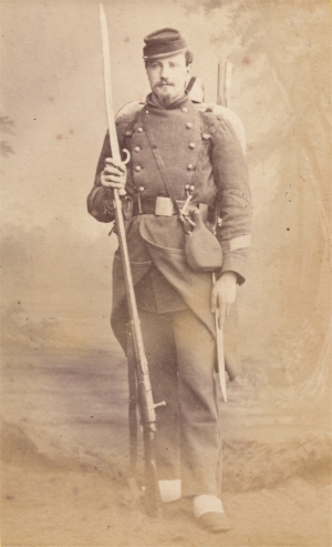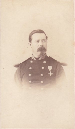 De parents inconnus, abandonné nourisson devant la porte de l'hospice de Mezières le 15/5/1837 "vêtu d'un surtout de laine tricotée, d'un bonnet d'indienne à petites fleurs, d'un corset d'indienne à fleurs violette et d'une chemise", Victor Pommier s'engage en décembre 1855 au 90e régiment d'infanterie. Après avoir servi en Algérie et durant la campagne d'Italie, il est nommé sergent major en février 1864. Il en porte ici à gauche la tenue de 1867, avec un chevron d'ancienneté reçu depuis 1866 pour sept années révolues de service (un chevron pour cinq années auparavant). Il accède à l'épaulette de Sous lieutenant le 7/8/1869 et passe au 81e régiment d'infanterie en garnison à Paris et à Fontainebleau. Le 81e régiment d'infanterie est engagé en 1870 à l'armée du Rhin et fait toutes les batailles autour de Metz.
