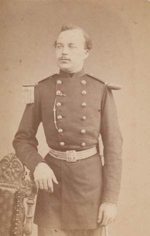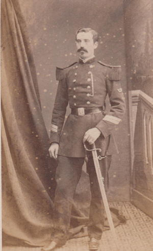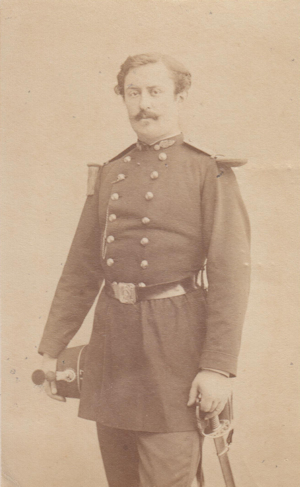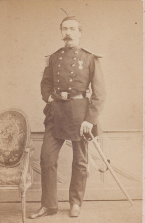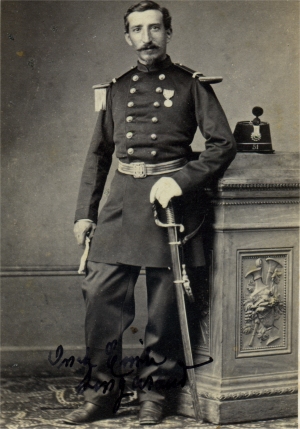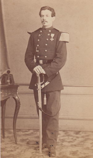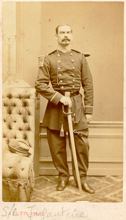 Saint cyrien, jeune Sous lieutenant du 47e régiment d'infanterie, Emmanuel de Bertier adresse cette photo à des proches en juillet 1870, à la veille de son départ pour la guerre : "Partant pour Colmar, vous embrassant de tout coeur et vous priant de ne pas l'oublier dans vos prières - Emmanuel". Le 47e régiment est décimé le 6/8/1870 à Woerth. De Bertier échappe à la mort, mais il est blessé d'un coup de feu non pénétrant à la partie abdominale. Prisonnier de guerre après Sedan, il finit sa carrière comme colonel du 118e régiment d'infanterie. Photos Maunoury (Paris) |