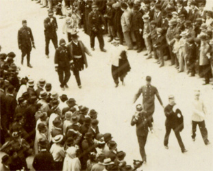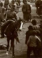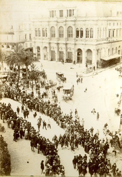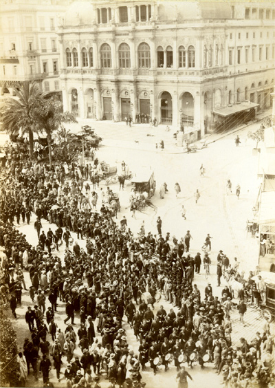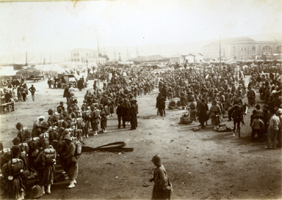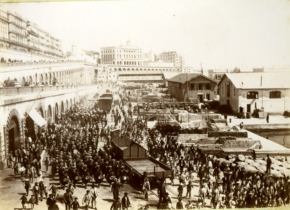 L'arrivée au port Cette superbe prise de vue nous plonge dans l'atmosphère du départ. Sous les acclamations d'une foule vibrante et les cris des enfants, la nouba, précédée par son tambour major, arrive sur les quais du port d'Alger. Au second plan un officier à cheval ouvre le défilé des troupes qui vont être embarquées. Les docks sont encombrés d'un matériel nombreux, qui attend d'être chargé sur les navires, pour une voyage qui durera trois à quatre semaines. | |