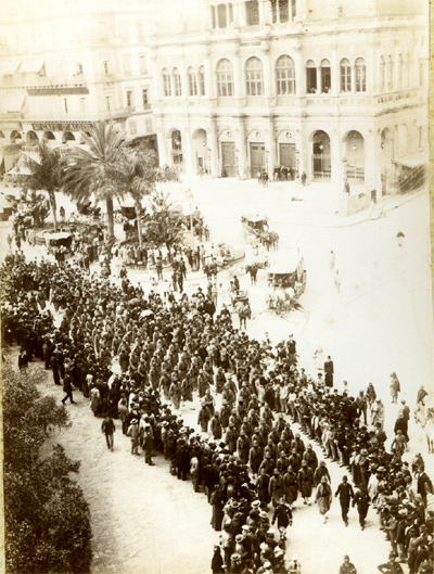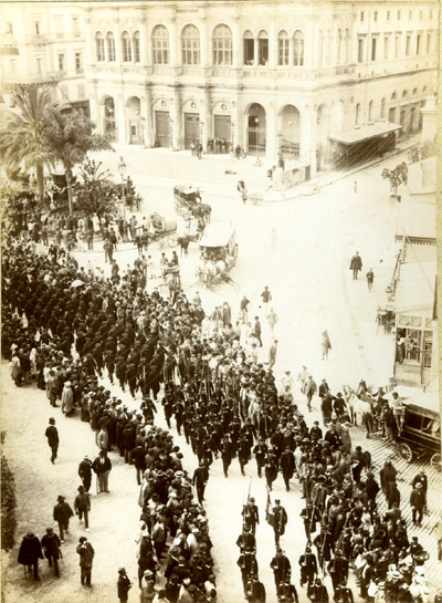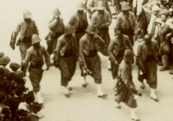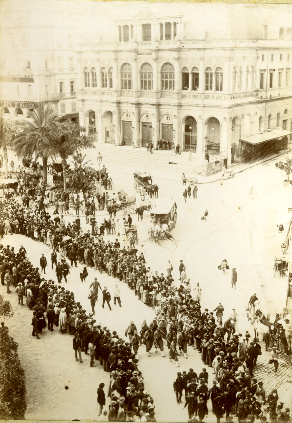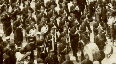 C'est une fanfare de zouaves qui accompagne le défilé. Ces hommes resteront à Alger, car le corps expéditionnaire ne comprend pas de troupes de cette arme.