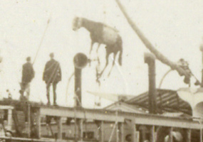 L'embarquement L'heure est enfin arrivée. Devant le "Marseille", des chevaux sur un chaland attendent d'être chargés.Un animal terrifié est hissé au palan pour l'embarquement.
