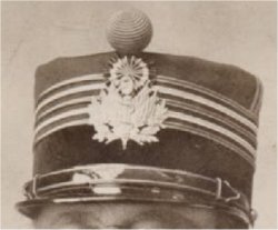 Collet et bandeau de képi en velours rouge. En grande tenue, le képi est orné d'un motif figurant un caducée sur des drapeaux. |