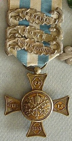 Créée par le Pape pie IX le 14/11/1867 pour commémorer la victoire de Mentana (13/11/1867) au cours de laquelle Garibaldi fut défait. Son ruban est blanc, divisé en cinq bandes verticales par deux raies bleu ciel. Il existe deux agrafes (Mentana et Roma).