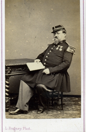 Ces trois peu banales photographies de groupe des officiers du 11e bataillon de chasseurs ont été prises à Besançon. Le photographe Fragney, installé en ville depuis 1865, a choisi de mettre en scène les officiers dans une pose traditionnelle et deux plus originales : "la partie de cartes" et "le rapport", ces deux dernières illustrant les moments coutumiers de la vie de garnison.