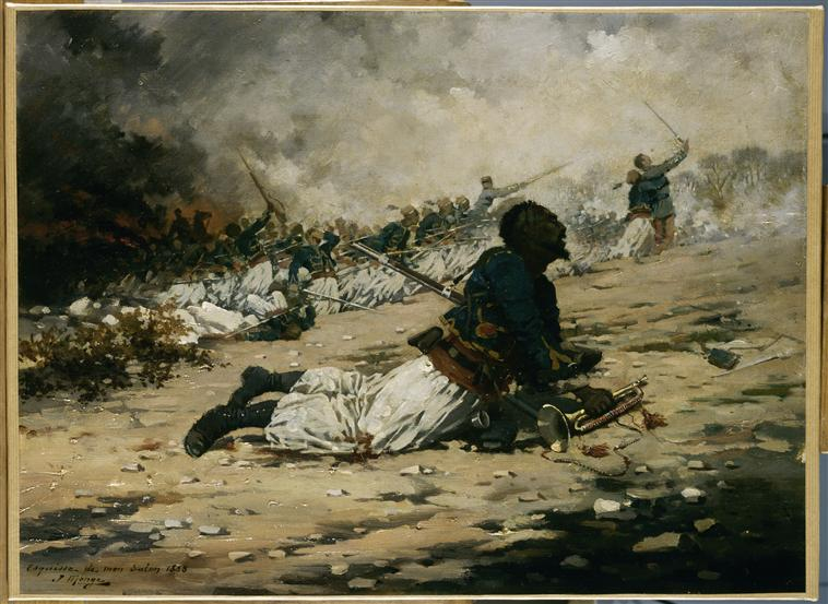 Le drapeau du 1er turcos, fièrement porté par le sous-lieutenant Bourdoncle, fait flotter au-dessus des sabres-baïonnettes, ébréchés par la mitraille, ses plis tricolores que trouent les balles ennemies.