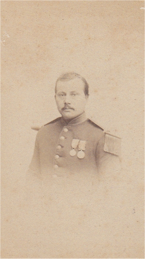 Sous officier sorti du rang, il a été nommé Sous Lieutenant peu après la campagne d'Italie à laquelle il a partcipé. En 1870, il est Lieutenant depuis le 10/8/1868, servant à la 1er compagnie du 3e bataillon. Il est blessé à Rezonville le 16/8/1870. Photo Beaudelaire (Strasbourg) |