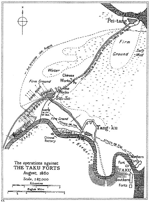 Sur les indications de l'amiral Protêt, on avait d'abord fait choix d'un point de débarquement sur la rive droite du Pé-ho. Une reconnaissance dirigée par le lieutenant-colonel Schmitz, rendit compte que le changement de saison avait totalement transformé l'état des terrains reconnus par la marine, et le point définitivement adopté l'atterrissement fut l'embouchure du Peh-Tang-Ho.