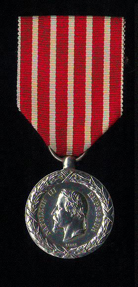 Créée par décret impérial du 11/8/1859 pour être "accordé par l'Empereur à tous les militaires, soldats et marins qui auront fait la campagne d'Italie". Il existe plusieurs modèles de cette médaille dont les deux plus courants sont donnés ci-dessus. Le ruban est rouge à 5 grosses raies verticales blanches.