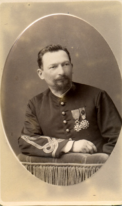 Lieutenant le 21/6/80 au 121e RI, il est chef d'annexe au bureau arabe de Chellala (cercle de Boghar, subdivision de Médéa). Il commande les goums de Taguin pendant l'insurrection du sud oranais. Officier d'académie (80), Chev LH (82), Officier du Nicham Iftikar (82), Chev du Mérite Agricole (87), médaille coloniale ("Algérie"). Son administration fut marquée à Chellala, où il resta 12 ans, par d'importantes créations, sachant "se montrer ferme et bienveillant et joindre à un jugement sûr une activité à toute épreuve et un faculté de travail infatigable" Capitaine le 10/5/87 au 86e RI, il est détaché hors cadre aux affaires arabes. En 7/92 il devient chef de bureau de première classe. En fevrier 1893 il est nommé sous chef du service des affaires indigènes et du personnel militaire au gouvernement général de l'Algérie à Alger, puis chef de ce même bureau en septembre 1894, en remplacement du commandant Bissuel. Off de l'Ordre Royal du Cambodge et du Dragon d'Annam. Chef de bataillon en 7/98. Off LH (00), Croix de la reine de Madagascar. Retraité en 1901, il décède en décembre de la même année à Mustapha. Photo Geiser (Alger) |