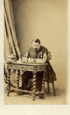 Le 7/5/1859, il est promu chef de bureau de 2nd classe au bureau de Sebdou. Le 1/5/1863, il est nommé chef de bureau de première classe au bureau de Mostaganem. Ayant reçu la croix de la Légion d'Honneur le 12/8/1864, il est nommé directeur à la direction provinciale des affaires arabes d'Oran le 28/10/1869. La guerre ayant éclate, il rejoint le 2e régiment de marche des tirailleurs algériens, avec le grade de Chef de bataillon. Il embarque pour la France et arrive à Marseille le 27 janvier 1871. Dirigé sur Perpignan, pour le mintien de l'ordre, il ne participe pas aux opérations contre les Prussiens. Il retrourne en Algérie en juillet 1871 et est nommé commandant supérieur du cercle de Biskra. Il est promu officier de la Légion d'Honneur le 31/5/1871. Promu Lieutenant Colonel le 8/10/1875, il revient en France au 20e régiment d'infanterie. Le 26/4/1881, il est nommé Colonel et prend le commandement du 9e régiment d'infanterie. Il revient brièvement en Algérie entre juillet 1181 et fevrier 1182 pour participer aux opérations contre les mouvements insurrectionnels. Le 29/9/1887, il est promu commandeur de la Légion d'Honneur, peu avant sa mise à la retraite. Il est mort en mars 1910. Photo Jamin (Paris) |