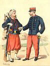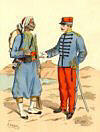L'origine des tirailleurs ("Turcos") remonte à divers corps irréguliers turcs et arabes formés par les Français dès 1833. Ce n'est qu'en 1841 que furent constitués les trois premiers bataillons de tirailleurs indigènes. Lors de la guerre de Crimée, un régiment de marche des tirrailleurs fut crée (3 bataillons) et le 10/10/1855, un décret impérial ordonna la création définitive de trois régiments de tirailleurs, un par province. | |