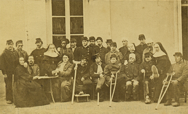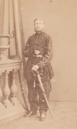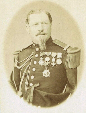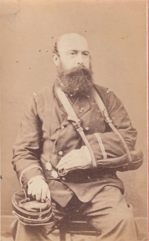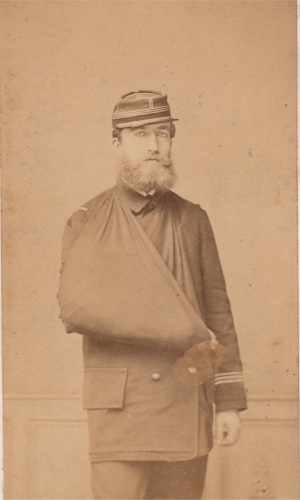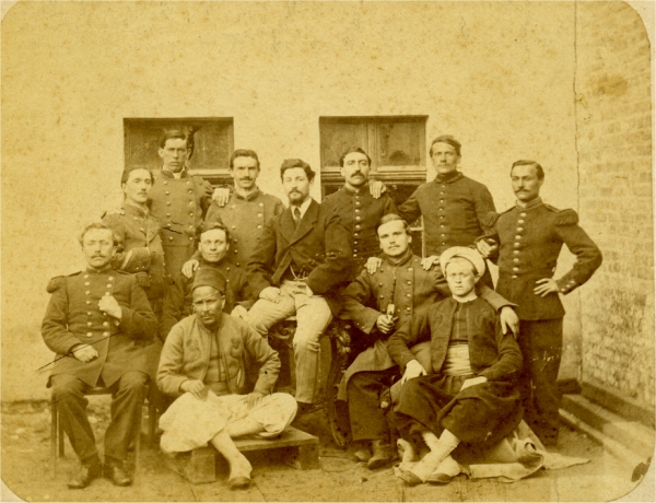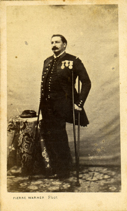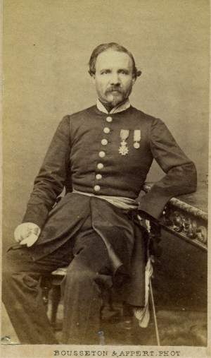Roy est promu Sous Lieutenant le 4/6/1850 et passe au 16e régiment d'infanterie légère. Le régiment quitte l'Italie en septembre et rejoint directement l'Algérie où Roy va faire campagne quatre années de plus. Il en revient décoré de la médaille du siège de Rome ainsi que de l'Ordre de Saint Grégoire le grand. Durant la campagne de Kabylie, il est blessé d'un coup de feu au cou le 17/6/1854 et reçoit la croix de la Légion d'Honneur en juillet. . Promu Lieutenant le 30/12/1854, il embarque pour la Crimée. Il y est blessé une première fois le 26/8/1855 en étant de service aux tranchées, d'une contusion au genou droit provoqué par une pierre. . Nommé capitaine le 30/8/1855, il participe à l'attaque de Malakoff du 8 septembre. Durant l'assaut, il est contusionné par d'un coup de feu au front et gravement blessé de deux coups de feu au bras gauche qui nécessitent son amputation. Roy passe en juin 1856 au 1er régiment de voltigeurs et reçoit la croix d'officier de la Légion d'Honneur le 8/10/1857. Son handicap le tient eloigne de la campagne d'Italie. Il est alors admis à la pension de retraite en 186. Il prend alors la fonction d'adjudant au palis du Trianon à Versailles jusqu'à sa retraite en 1873. Photo Hideux (Compiègne) |