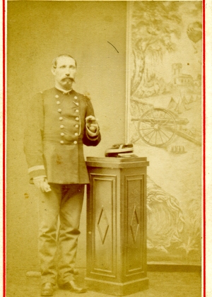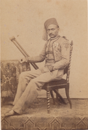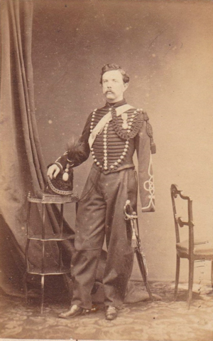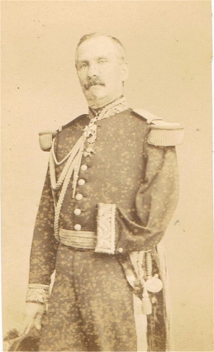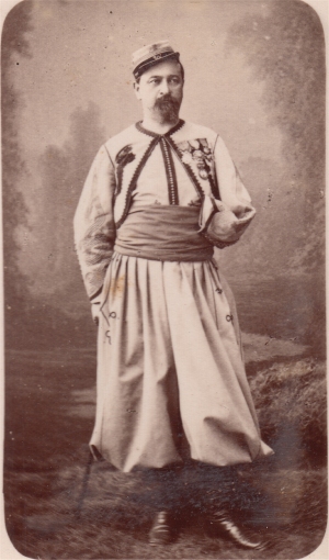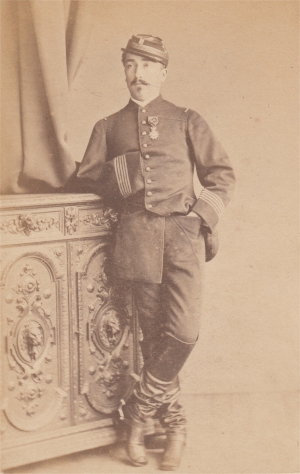 Promu officier Sous Lieutenant le 6/1/1865, il passe au 2e régiment de chasseurs à cheval et reçoit la croix de chevalier de la Légion d'Honneur le 18/7/1865. ("13 ans de services effectifs, quatre campagnes, deux blessures. Amputé du bras gauche à la suite d'un coup de feu reçu au combat de Teniet El Rihh") Retraité, il reçoit la tenue d'une perception. Il est mort en 1920. Photo Prevot (Paris) |