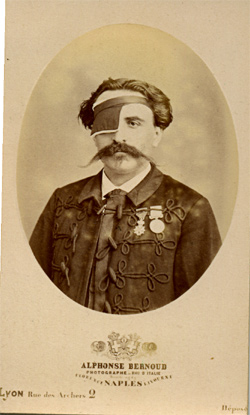 Laurent Pelnard Né le 27/9/1832, fils de bottier, Pelnard est engagé volontaire en septembre 1851 au 23e régiment d'infanterie où il est fait caporal en juin 1853. Passé au 95e régiment d'infanterie en mars 1854, il embarque pour l'expédition d'Orient deux mois plus tard. Il est promu sergent fourier en mars 1855 et rentre en France en mai 1856, décoré de la médaille britannique de l'expédition. Libéré du service en 1858, Pelnard garde néanmoins des attaches avec l'armée et lors du déclanchement de la guerre de 1870, il rejoint la 1er légion du Rhône comme volontaire et y est nommé Capitaine le 20/10/1870. La légion fait campagne à l'armée de l'est et lors du combat de Nuits le 18/12/1870, subit d'importantes pertes. Pelnard commande la compagnie embusquée derrière le chemin de fer. "La situation devient critique, les munitions s'épuisent et le ralentissement de notre feu est mis à profit par les Badois. ils avancent toujours ; nous les distinguons maintenant à moins de 100 metres, courbés et marchant par bonds au milieu des vignes. Bientôt ils atteignent la tranchée, et nous nous fusillons d'un bord à l'autre. Sur certains points on arrive au corps à corps. C'est à ce moment que notre capitaine reçoit à travers la figure une balle qui lui arrache un oeil. On l'emmène, aveuglé par le sang, à l'ambulance. plusieurs camarades tombent autour de lui. [...] La blessure dont il resta défiguré lui valut la croix de la légion d'Honneur. Il vécut encore de longues années après la campagne, promenant non sans fierté dans la ville de Lyon, où sa silhouette originale était bien connue, le bandeau noir qui lui battait le visage et recouvrait l'affreuse cicatrice de son oeil arraché" (Etapes et combats d'un régiment de marche en 1870, 1ere légion du Rhone - C Berthet) Rendu à la vie civile en mars 1871, il est mort en novembre 1890. Merci à D.Granjon pour l'identification. Photo Bernoud (Lyon) |