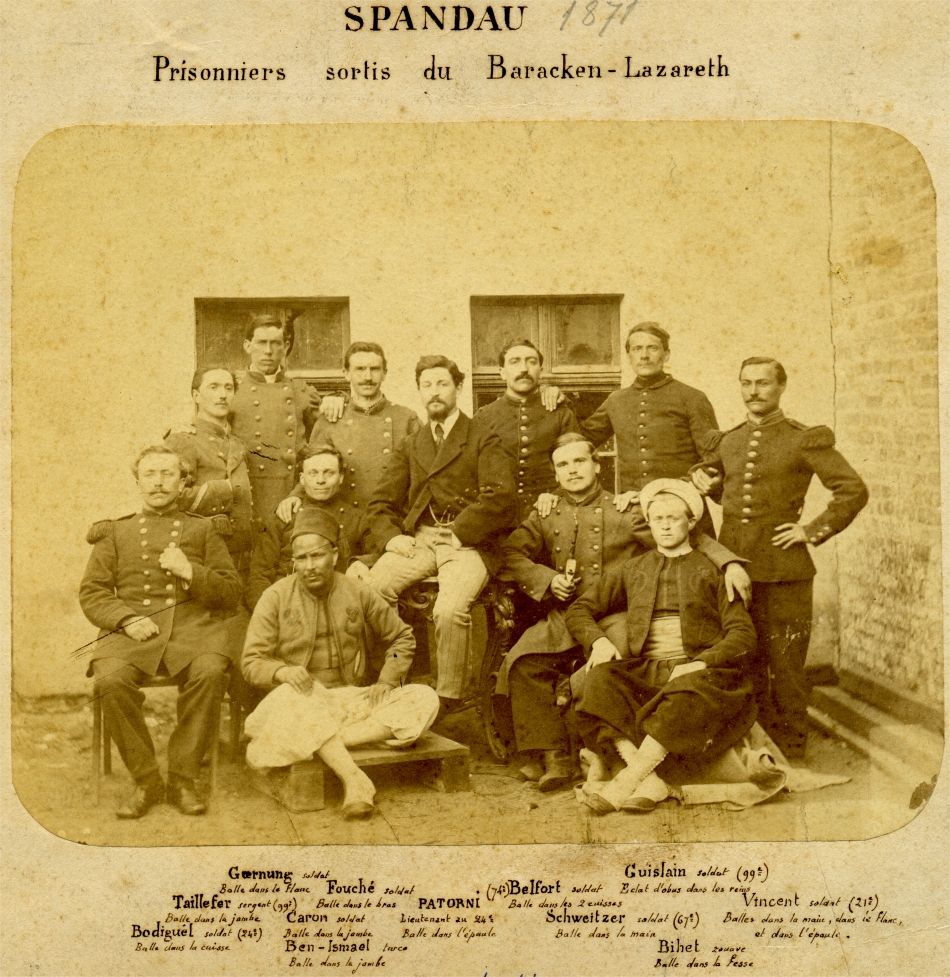 Monteillet sert au 1er bataillon qui est envoyé défendre le château du Geissberg "un assemblage de bâtiments entourés d'une vaste cour et enfermés par un mur solide de 15 pieds de hauteur. Un potager à plusieurs rangs de terrasses est situé à l'avant du château et domine le terrain alentour. Une porte unique donne accès dans la cour du château, dont les rares fenêtres se trouvent à une hauteur considérable." Fait prisonnier, Monteillet est pansé par les Bavarois et se fait photographier par un photographe de la ville quelques semaines plus tard. Nommé chevalier de la Légion d'Honneur le 8/8/1871, il est retraité en 1874. Après avoir reçu la tenue d'une perception dans le Tarn. Il est mort le 26/11/1911. Photo Bernard (Wissembourg) |