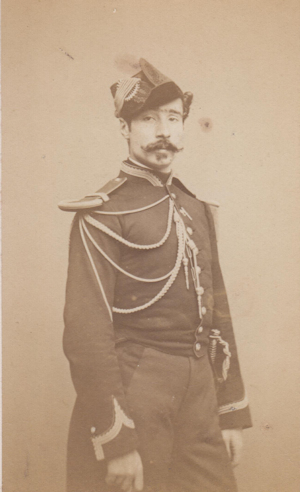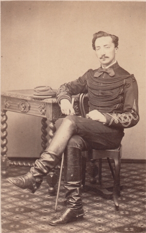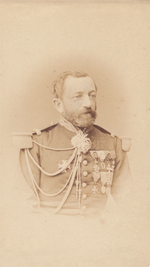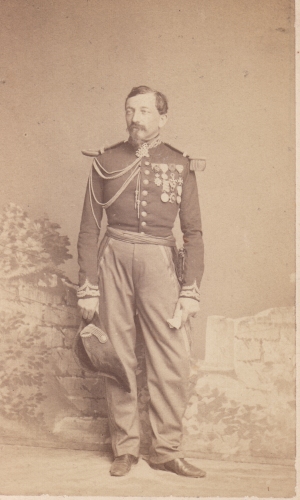 en janvier 1866. Promu Capitaine en juillet 1870, il fait la guerre de 70 à l'état major de la 3e division du 3e Corps d'armée (commandée par le général de Cissey). Prisonnier à Metz, il s'évade et rejoint l'armée de la Loire à l'état major du 21e corps d'armée. Il est promu chevalier de la Légion d'Honneur le 9/1/1871, suite à son action lors des journées du 12 et 15 janvier près du Mans, pour avoir, sous le feu de l'ennemi, sauvé deux pièces d'artillerie. En 1876, il est à l'état major particulier du ministre de la guerre, le général de Cissey, puis il est nommé son aide de camp. Il est promu Chef d'escadrons en décembre 1880, sert à l'état major du 1er corps d'armée, puis au 6em Régiment d'infanterie. Il est mis en retraite pour raison de santé en 1887 et sert ensuite dans divers postes d'état major territorial. Il est mort le 29/12/1912 Photo Carjat (Paris) |