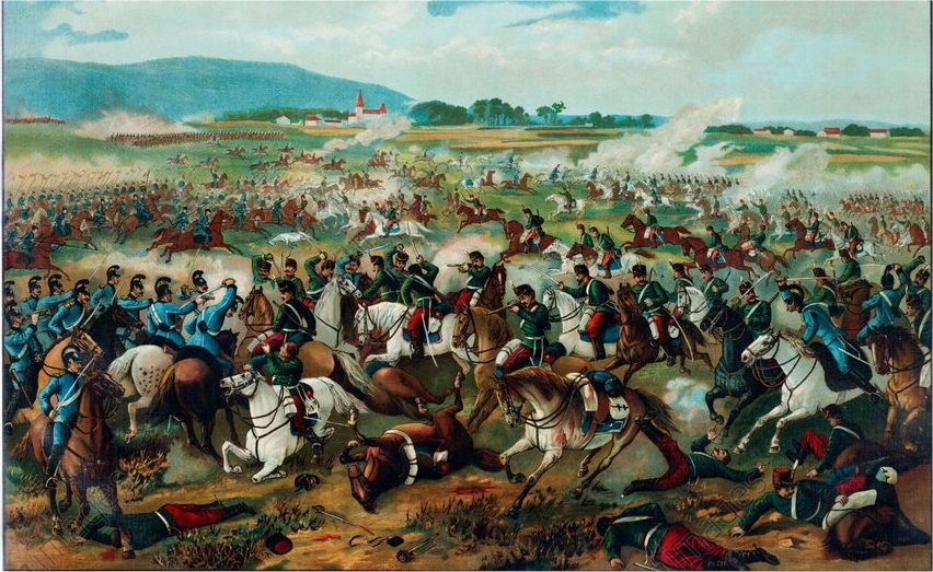 Mais là deux autres escadrons saxons nous chargent à leur tour. Accablé par le nombre, le 3e escadron de chasseurs redescend la pente à bride abattue jusque dans les rues du village. Cependant le 4e escadron qui se montre encore tout frémissant de son premier engagement, se reforme et s’élance. Le 3e escadron se rallie immédiatement après lui, le lieutenant colonel se met au centre avec les adjudants et les trompettes sonnent la charge en galopant derrière les escadrons. En avant !