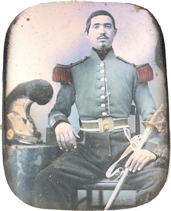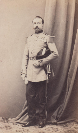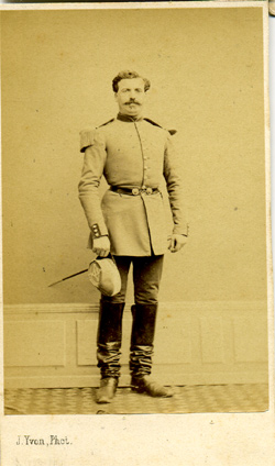 Officiers du 2e régiment de Carabiniers, 1865 1er rang (assis) : Medecin Jammes (1824-1871), Capitaine instructeur Vidal (1822-1866), Capitaine Beyne (1826-1879) 2e rang : Sous Lieutenants de Gapany (1832-1897), Kopff (1830-1895), Médecin Dujardin, Lieutenants Gin (1828-1900), Duval (1833-1882) |