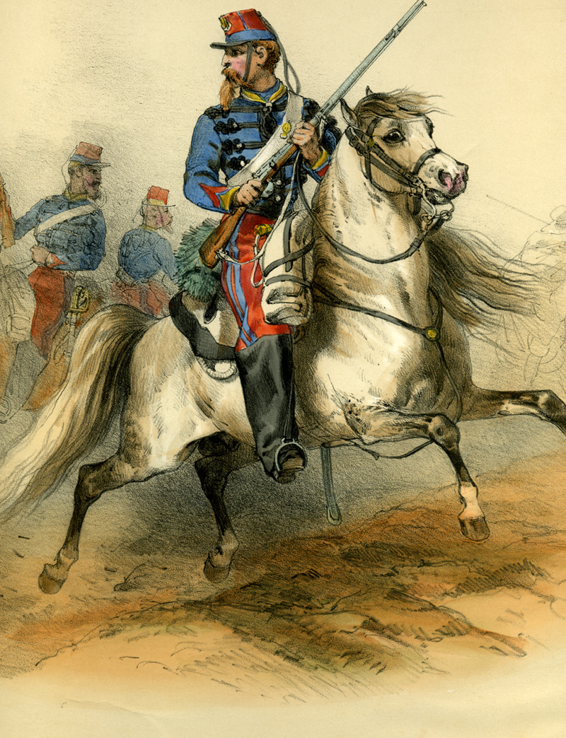 La tunique en drap bleu de ciel foncé (avec une rangée de 9 boutons) est remplacée par le dolman en 1862. Ce dernier est en drap bleu de ciel foncé et comporte 6 brandebourgs noirs. Collet jonquille.
