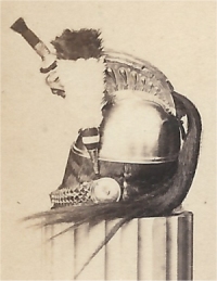 Le casque des officiers est orné du plumet écarlate, qui est tricolore pour les officier de l'état major du régiment.