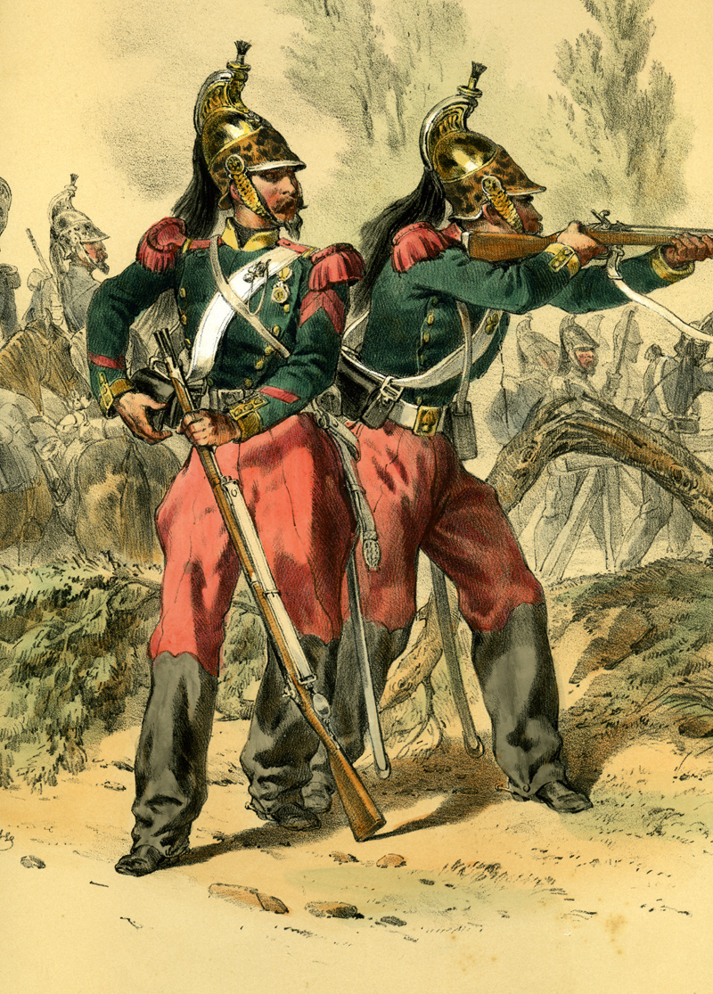 Armement : Fusil de dragons, pistolet de cavalerie (modèle 1822T), sabre de cavalerie de ligne modèle 1822 (lame légèrement courbe), remplacé par le modèle An XIII à lame droite vers 1860.