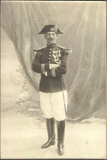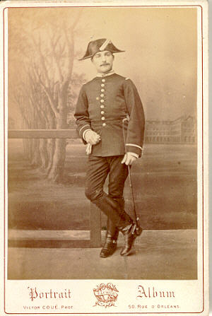 Gustave Marie Verschneider Né à Besançon le 11/5/1848, c'est un élève de Saint Cyr, entré à l'école en 1868 et dont la guerre interrompt la scolarité. Nommé Sous Lieutenant le jour de la déclaration de guerre (le 15/7/1870), il est affecté au 2e régiment de cuirassiers. Il fait alors la première partie de la campagne et participe à la charge de Reischoffen qui coûte à son régiment 140 hommes tués ou blessés. Ayant survécu à la charge, il continue la campagne et il est fait est prisonnier de guerre le 2/9/1870, le lendemain de la bataille de Sedan. Après la guerre, il est nommé Lieutenant le 19/7/1873 au 14e régiment de dragons et va parfaire sa formation à Saumur durant une année. Il rejoint une nouvelle fois l'école de Saumur en février 1875, comme professeur de grammaire. Nommé Capitaine le 23/7/1878, il conserve son poste à Saumur et y est photographié ci contre dans la tenue du corps professoral. Il est nommé officier d'académie en 1880. Le 3/10/1881, il va prendre son temps de commandement dans la troupe, au 22e régiment de dragons. Il est nommé Major le 13/7/1891 au 13e régiment de hussards et reçoit la croix de chevalier de la Légion d'Honneur le 30/12/1892. Il quitte le service l'année suivante. Il est mort le 12/7/1899. Photo Coué (Saumur) |