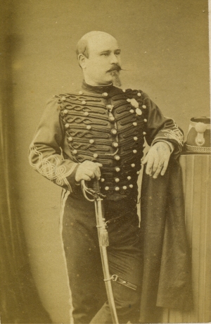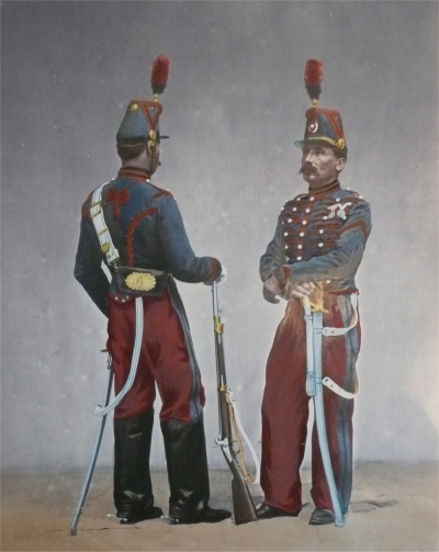 Dolman en drap gris de fer foncé, orné de 5 rangées de boutons et de 9 brandebourgs en laine ecarlate (dans l'intervalle des brandebourgs, la tresse carrée forme trois boucles ovales consécutives se terminant en pointe), collet et parements bleu foncé, pantalon garance à bandes gris de fer. Ils portent le schako.