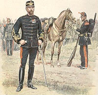 Officiers : Tunique du modèle de la troupe, mais en drap noir fin, galons en soutache autour de la patte du parement, épaulettes en or mat.