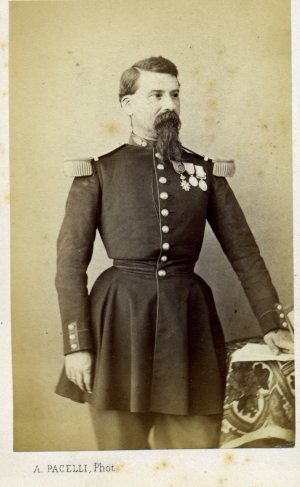 Frederic Adolphe Yvon (1817-1893) expose au Salon à partir de 1841. Il se spécialise dans les scènes historiques et militaires. Il a notamment réalisé trois grands tableaux sur la guerre de Crimée : La prise de la tour de Malakoff (présenté au salon de 1857), la gorge de Malakoff et la courtine de Malakoff (tous deux présentés au salon de 1859). Attentif au réalisme de ses travaux, il y a séjourné en Crimée en 1856 pour prendre connaissance des paysages et s'est attaché à représenter certains des officiers s'étant illustrés sur le champ de bataille, en réalisant de nombreuses esquisses de leur portraits, encore conservées dans les reserves du musée de Versailles.
