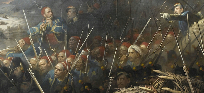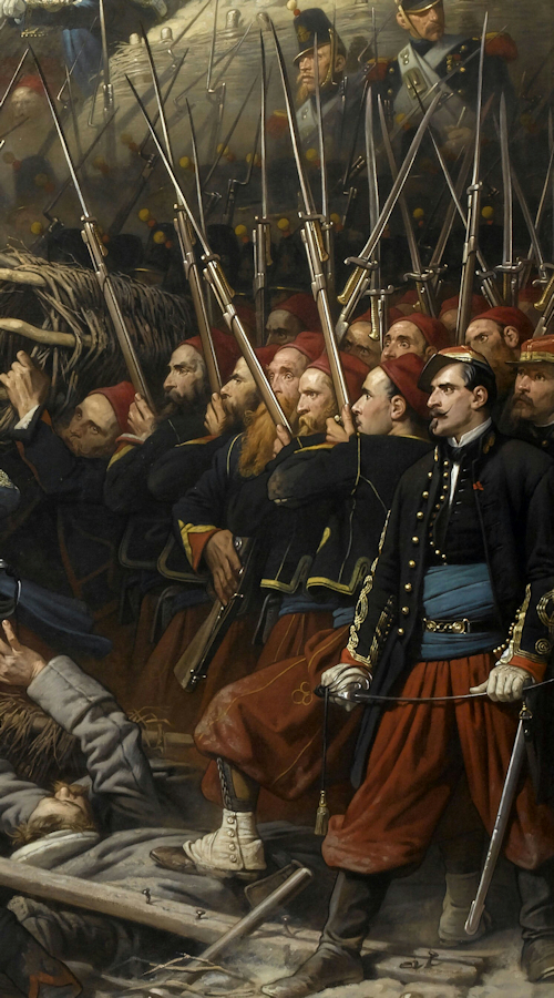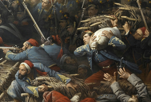 Le peintre a voulu représenter en une unique scène plusieurs épisodes de ce combat sanglant, et y a associé différents régiments de la ligne (20e et 27e régiments), des troupes d'Afrique (tirailleurs algériens) et de la Garde Impériale (régiment des zouaves et 2e régiment des voltigeurs).