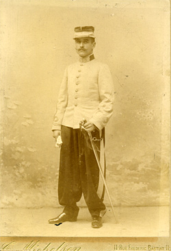 Philippe Guillaume Roger Marty Saint Cyrien de la promotion "premier des grandes manoeuvres" (1896-1898), il en sort Sous lieutenant. Nommé Lieutenant le 1/10/1900 au 2e régiment de tirailleurs algériens. Il y est photographié dans la belle tenue de 1894 lors d'une permission en France. Il prépare l'école de guerre et y est reçu. Bréveté d'état major, il revient en garnison en métropole comme stagiaire au 125e régiment d'infanterie Il quitte l'armée peu de temps après. Photo Michelsen (Bayonne) |
