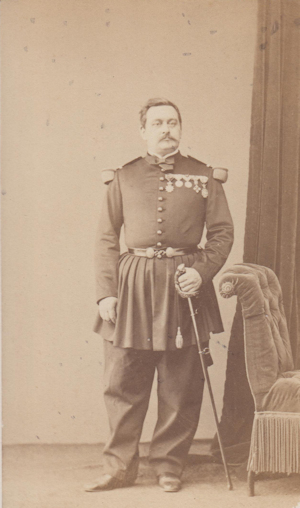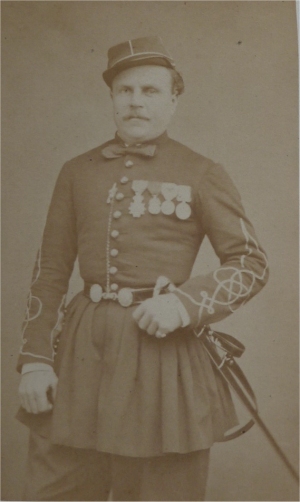 Aimé Honoré Grincourt Né le 17/1/1833 à Rethel (Ardennes). Engagé volontaire au 1er régiment de la Légion étrangère en Algérie le 8/8/1852, il y est fait caporal (1/3/1853). Parti pour l'Orient le 11/6/1854, il fait campagne vers Varna, puis en Crimée lors de la bataille de l'Alma et le siège de Sébastopol. La légion s'y distingue notamment dans la nuit du 22 au 23 mai 1855 et Grincourt est affecté aux compagnies d'élite du régiment chargée d'attaquer les ouvrages russes devant le cimetierre. Il y est blessé par des eclats de pierre à l'épaule gauche et est cité à l'orde de l'armée. Revenu en Algérie en juin 1856, il est fait sergent. Le 16/4/1856, comme sergent major il passe au 2e régiment étranger , avant un an plus tard de rejoindre le 2e régiment de zouaves. Il reçoit la médaille militaire le 14/8/1860. Le 17/11/1861 il fait partie du bataillon qui embarque pour le Mexique où il va rester jusqu'en mai 1865. Grincourt fait d'abord la première partie de la campagne qui conduit à l'assaut raté de Puébla. Il est fait Sous Lieutenant le 30/6/1862. Entre aout 1863 et juin 1864, il commande le dépôt des isolés et adjudants de place à Vera Cruz et se distingue le 11/8/1863 en commandant une forte escorte composée de la contre guerilla, d'une companie de la Légion et d'une compagnie du bataillon soudanais, chargée d'escorter un convoi de 12 million de francs entre Vera cruz et Orizaba. Il est fait chevalier de la Légion d'Honneur le 14/8/1863 ("11 ans de service effectif, 11 campagnes, une blessure, serviteur très consciencieux"). Grincourt rejoint le 7e bataillon de chasseurs à pied le 25/12/1867 et y est nommé Lieutenant trésorier huit mois plus tard. Durant la guerre de 70, il est promu Capitaine au 18e bataillon de chasseurs (6/10/1870) et sert successivement aux 21e et 23e bataillon. Après la guerre, Grincourt se stabilise. Il passe comme capitaine trésorier au 32e régiment d'infanterie en 1872 et se marie la même année. Entre 1874 et 1876 il commande le pénitencier militaire de Douéra en Algérie. Son fils né à Douéra, fera Saint Cyr et sera blessé le 6/9/1914 comme capitaine de tirailleurs algériens. Le 6/7/1883, il est promu Chef de bataillon puis est retraité en 1884. Il reprend néanmoins du service entre 1890 et 1893 dans le service des places. Fait officier de la Légion d'Honneur en 1907, il est mort un an plus tard. . Photo Mulot (Paris) |