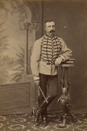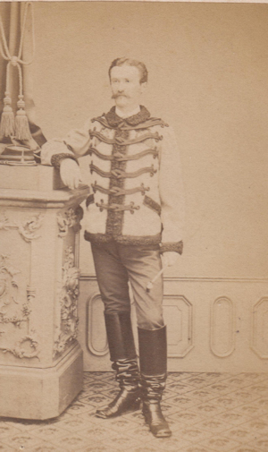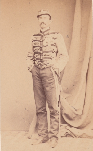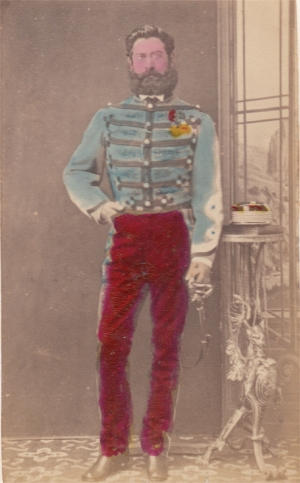 Melchior Eusèbe Antoine Rozier de Linage Il est né le 10/5/1835 à Voreppe dans l'Isère A sa sortie de l'école de Saint Cyr (promotion Crimée 1854-1856), il est nommé Sous lieutenant au 9e régiment de chasseurs à cheval. En 1863 il part au Mexique comme Lieutenant au 3e régiment de chasseurs d'Afrique. Nommé Capitaine le 22/12/1866, il commande un escadron lors des deux charges du régiment à la bataille de Sedan en septembre 1870. Lors de la première, le matin vers le village d'Illy, son escadron est désorganisé par le ruisseau et de Linage doit rallier le reste du régiment en effectuant un large détour. Lors de la seconde charge de la journée sur Floing, après 100 metres, il tombe inanimé frappé de plusieurs blessures : une balle qui lui fait un séton dans la cuisse gauche et tue son cheval, une autre balle qui lui traverse la figure, brisant les dents, le palais et une partie de l'oreille droite. Il est ramassé en fin de journée par l'ennemi. Nommé Chef d'escadron le 23/12/70, il combat en Algérie avec son régiment Après avoir été Colonel du 2e régiment de dragons de 1880 à 1884, il finit sa carrière comme Général de brigade, commandant la 3e brigade de cuirassiers et décède en 1887. Photo Sarrault (Constantine) |