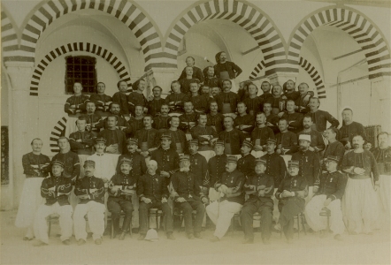 Après la campagne de Tunisie en 1881, le 4e régiment de Zouaves est envoyé stationner dans la nouvelle colonie française. Il va y rester jusqu'en 1914. Vers 1897, les officiers supérieurs du régiment, entourant le colonel Cauchemez, se font photographier avec les sous officiers du régiment. A cette époque, le corps des officiers figure encore parmis l'élite de l'armée, les plus méritant choisissant cette affectation de choix, souvent selectionnée pour la participation aux campagnes actives dans les colonies. Sur les 4 officiers supérieurs figurant sur la photographie, trois seront tués durant la guerre de 14. Leurs biographies figurent sur une page spéciale. Photo Gobillot (Tunis) |