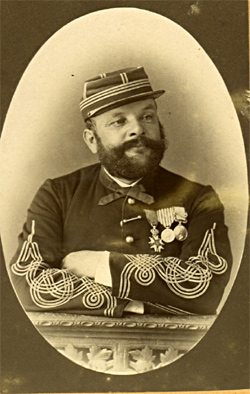 Né le 28/6/1851 à Rochefort, il fait l'école de Saint Cyr de 1870 à 1872 (promotion de la Revanche). Il est nommé Sous lieutenant en septembre 1871, au 6e RI. Lieutenant le 17/3/1877 au 4eme zouaves. Il est officier d'ordonnance du général de la tour d'Auvergne, commandant la subdivision de Médéa entre 1879 et 1882, ce qui explique le port des aiguillettes de l'état major visible sur cette photographie. Il sert ensuite en Tunisie avec son régiment. Capitaine le 2/6/1884. Il passe au 1er régiment zouaves en 1885 et il est nommé capitaine adjudant major. Il sert alors une année au Tonkin (mars 1887-avril 1888).Commandant le 24/12/1894, il est nommé major au 1er zouaves, puis chef de bataillon. Il est décédé en 1903 comme officier de la légion d'honneur. Photo Geiser (Alger) |