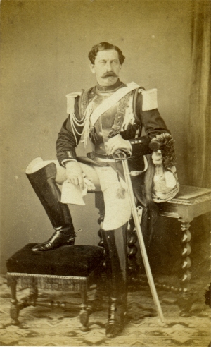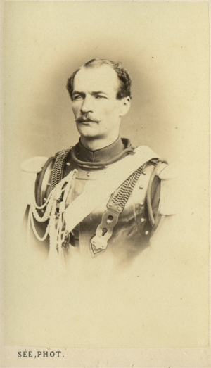 Né à Alger le 13/10/1832, c'est le petit fils du général Savary, duc de Rovigo, Ministre de la Police sous le Premier Empire. Elève de Saint Cyr en 1851, il est nommé Sous Lieutenant au 6e régiment de cuirassiers le 1/10/1853. Il passe au régiment des cuirassiers de la garde en 1854. Promu Lieutenant au 1er régiments des cuirassiers de la Garde le 30/12/1857, il démissionne de l'armée en mai 1861. Cette courte carrière militaire nous laisse cependant ce beau portrait, en grande tenue, avec casque sur la tête.