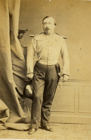 Né le 21/4/1827 à Paris, le baron de Cools est Saint Cyrien. Entré en 1845, il en sort 48e sur 291 et est nommé Sous Lieutenant le 1/10/1847 au 8e régiment de cuirassiers. Il rejoint ensuite l'école de Saumur comme officier élève et en sort classé 3e sur 55. En octobre 1849, il rejoint le 3e régiment de Dragons. il est nommé Lieutenant le 4/2/1850. Il retourne une année à Saumur en qualité d'officier d'instruction Le 20/11/1852 il est nommé Capitaine instructeur au 2e régiment de chasseurs à cheval.. Le 22/6/1856, il rejoint la Garde Impériale au régiment des cuirassiers de la Garde et il prend le commandement d'un escadron en octobre 1860. Il porte ici la grande tenue de prise d'armes Le 20/8/1863, il est promu Chef d'escadrons au 1er régiment de Dragons. Il est promu chevalier de la Légion d'Honneur le 29/12/1865. Il démissionne de l'armée en juillet 1867. En avril 1870, il est nommé Chef de bataillon de la garde national mobile d'Indre et Loire. Il participe à la guerre de 70 (du 1/10/1870 au 7/3/1871) et est nommé Lieutenant Colonel. Il est nommé officier de la Légion d'Honneur le 22/3/1872. C'est le frère ainé du général de Cools, qui finit sa carrière comme membre du conseil supérieur de la guerre. Il est mort dans se demeure du chateau de la Noue le 21/9/1890. Photo Hideux (Compiègne) |