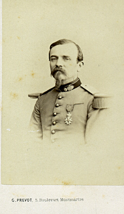 au 3e tirailleur algérien. Le 4/3/1868, il est nommé Lieutenant Colonel du 12e régiment d'infanterie, alors présent en Algérie et qui rentre en France au mois d'avril. Le guerre de 70 le trouve toujours dans cette position. Le régiment est engagé dans la défense de Saint Privat et écrase de ses feux l'assaut de la garde prussienne, avant de devoir évacuer le village sous la pression du corps saxon, perdant 690 hommes dans la journée. Mercier est promu Colonel le 16/9/1870 au 10e régiment d'infanterie, poste qu'il occupe jusqu'en 1878. Il finit sa carrière commandeur de la légion d'Honneur. Photo Prévot (Paris) |