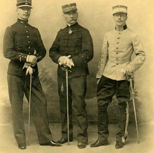 A Gauche Maurice Larchey, né le 17/12/72, Saint Cyrien, il a servi comme lieutenant au 24e bataillon de chasseurs. Promu capitaine en 1907, il fait la guerre de 14 au 11e bataillon de chasseurs et il est tué le 20/8/14 au combat de Bellefosse (Bas Rhin)
