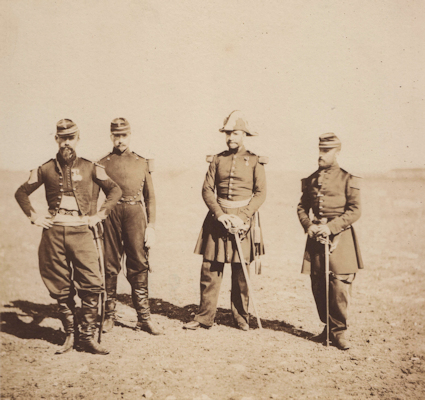 Georges Beuret Né en 1803, fils d'un général, Beuret a fait campagne en Espagne, en Morée (1829), au siège de Rome et surtout en Crimée où il s'est signalé aux combats du 14/5/1855 et du 22 mai/1855. Promu général de brigade en Crimée (photo ci contre avec son état major sur cette image de Fenton prise en Crimée), il commande une brigade du corps de Forey et trouve une mort glorieuse le 20/5/1859 lors de l'assaut furieux sur l'eglise et le cimetiere de Montebello. |
