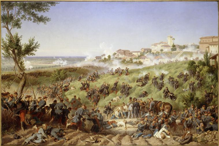 Conduits par le général Forey, le 17e bataillon et les 74e et 84e de ligne s'élancent sur le village de Montebello.