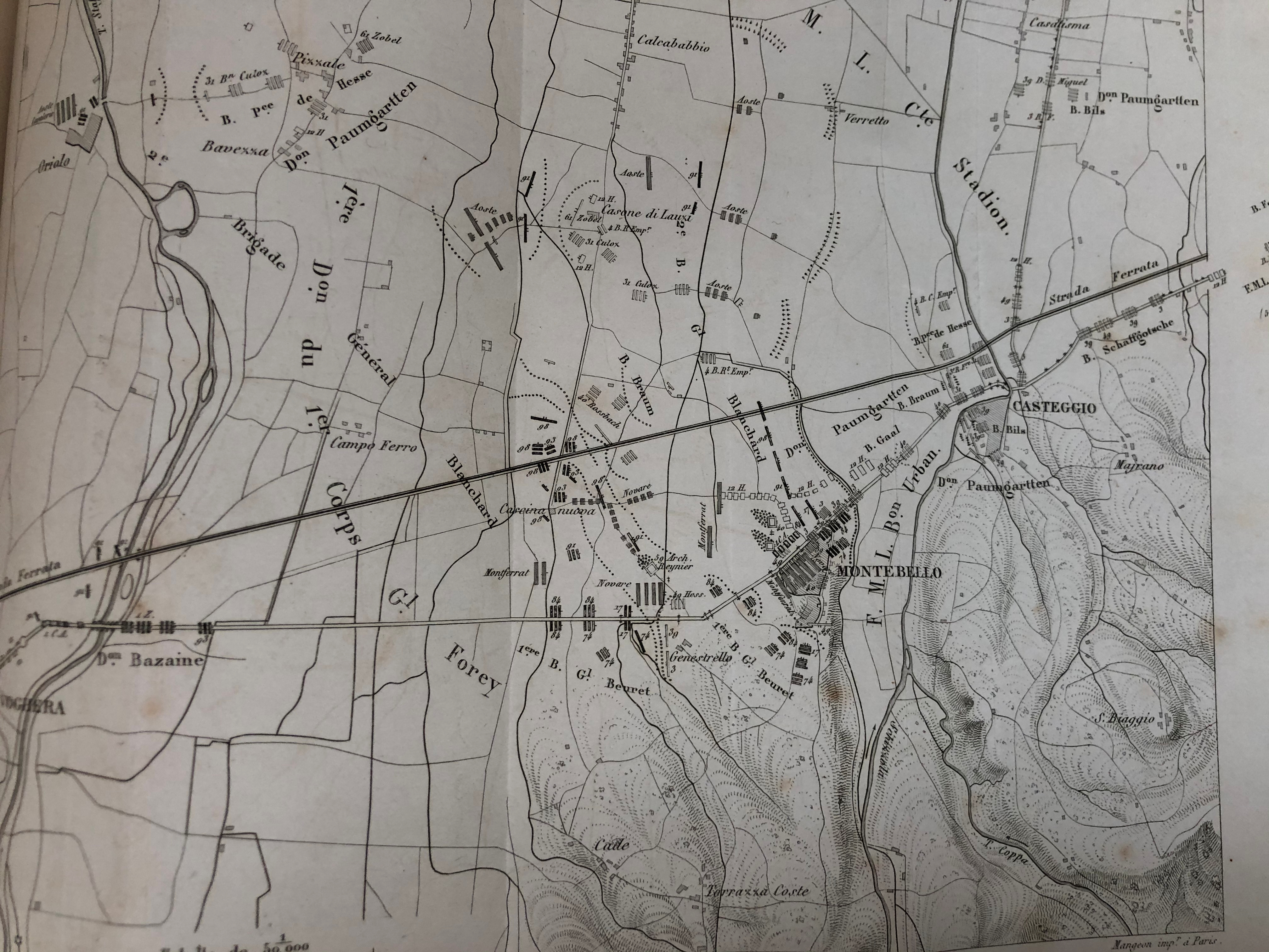 Lorsque le général atteignait la hauteur du petit pont jeté sur le ruisseau de Fossagazzo, il vit venir à lui les avant-postes de la cavalerie piémontaise qui se repliaient en bon ordre devant les colonnes autrichiennes, après leur avoir longtemps opposé une Vigoureuse résistance. L'ennemi, dont le nombre augmentait à chaque instant, s'était emparé de Casteggio, et s'était étendu dans les terrains montueux qui entourent ce village. En même temps il envoyait une brigade au pas de course sur Montebello; cette brigade occupait ce village et se portait en avant sur Genestrelli qu'elle envahissait, disséminant ses tirailleurs dans les plis de terrains, dans les blés, et au milieu des plantations et des vergers.