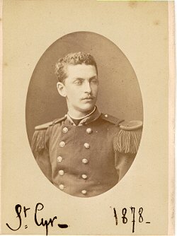 ESM en 1874. Sorti 97e sur 393. Sous lieutenant en 1876 au 3e Hussards (il fait 1m63), il suit les cours de l'école de cavalerie de 1876 à 1877 (sorti 29e sur 80). A sa sortie il passe au 2e Chasseurs. Il est affecté à la révision de la carte de France en 1879.