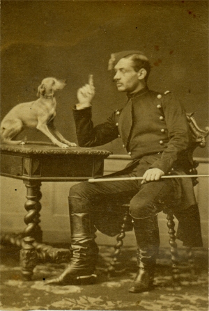 Le lieutenant des Isnards du 10e régiment de Dragons, est en formation à Saumur sur ce cliché de 1862. Avant de commander les hommes, il s'exerce sur les chiens, avec un succès mitigé semble-t-il... Il faut penser que la formation ne sera pas concluante, puisque des Isnards démissionne de l'armée avant 1870. |